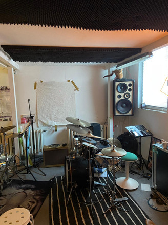 Grosser Raum mit Schlagzeug und Klavier und Stauraum